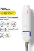 • Com múltiplas ponteiras e cartuchos de diferentes profundidades a serem escolhidas e trabalhadas conforme a demanda do profissional e disfunções estéticas.