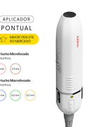 Pode ser acoplado ao aplicador correspondente e atua diretamente na camada subcutânea, com prega de 16mm. Sua tecnologia promove termocoagulação, gerando microlesões que desencadeiam resposta inflamatória para reparo tecidual, melhorando o aspecto geral da pele. A energia aplicada varia de 1 a 8J, com disparos únicos por ponto, podendo ajustar frequência de 1 a 9Hz. O equipamento reconhece o cartucho e exibe informações na interface sobre uso e configurações.